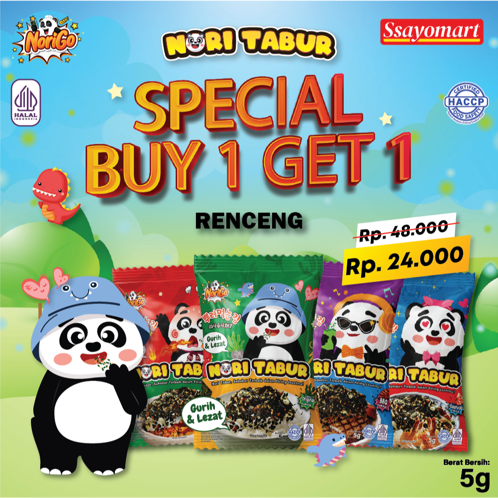 NoriGo menghadirkan Nori Tabur dengan potongan rumput laut panggang, dengan taburan rice noodle, biji wijen, bawang merah dan minyak wijen yang digunakan sebagai taburan toping pelengkap nikmat makanan lezatmu.