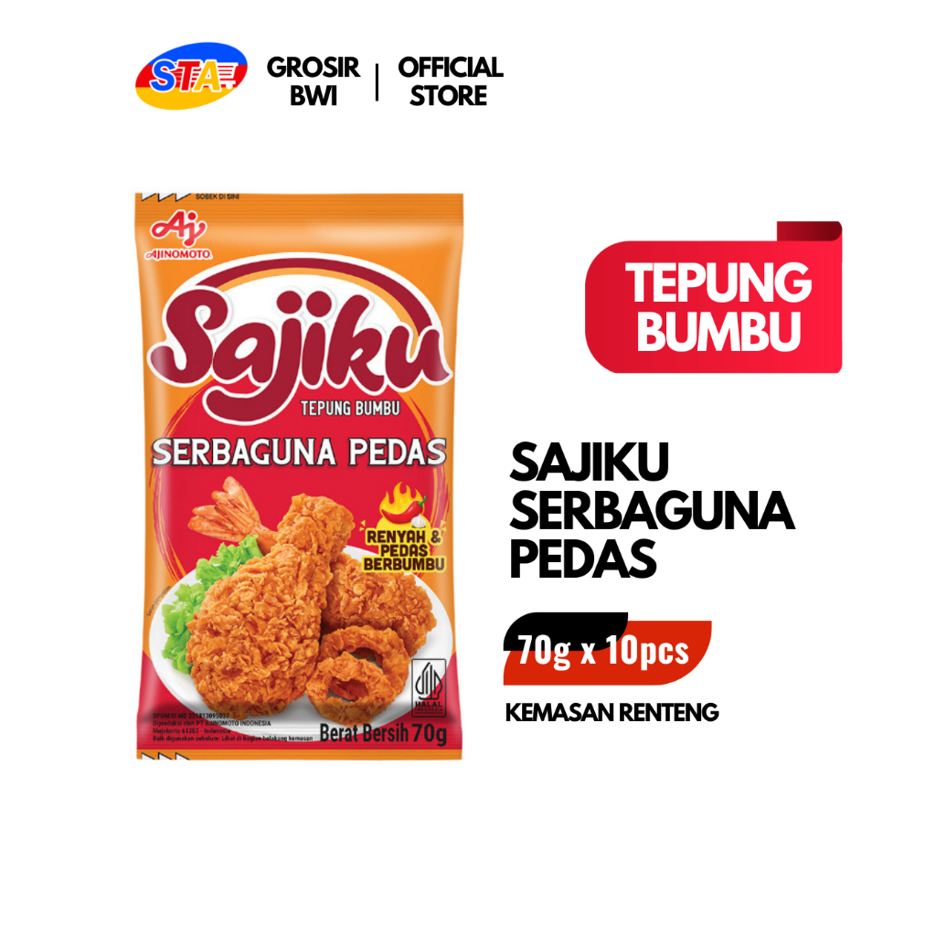 Sajiku® Tepung Bumbu Serbaguna terbuat dari perpaduan tepung dan bumbu rempah pilihan, yang membuat membuat hasil gorengan anda menjadi renyah dan lezat dengan cara yang praktis. Sajiku® Tepung Bumbu Serbaguna dapat digunakan untuk menggoreng berbagai jenis hidangan seperti ayam, ikan, udang, tahu, sayuran, dll.