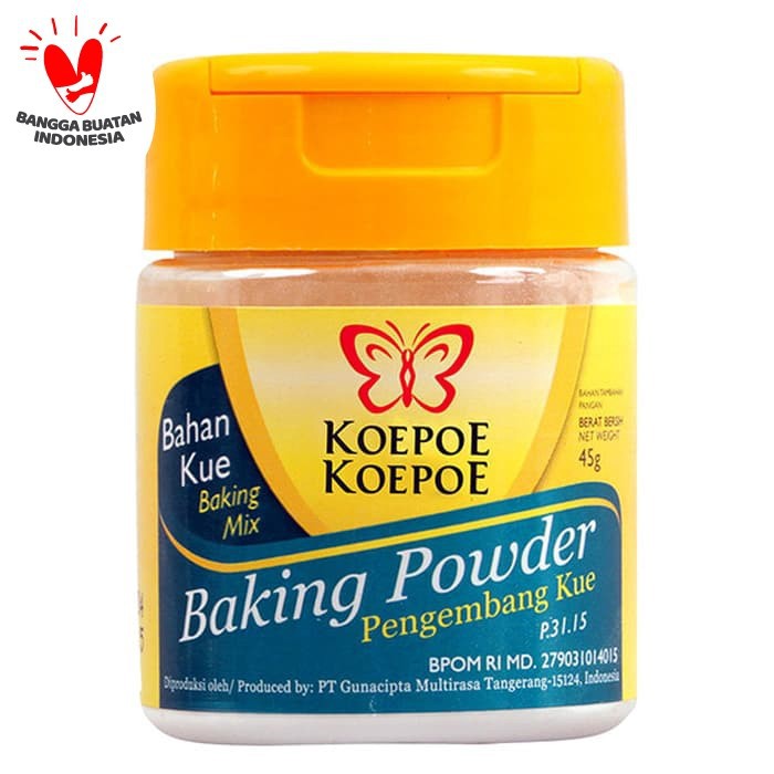 Baking powder Koepoe Koepoe digunakan untuk mengembangkan berbagai macam adonan kue, bolu, roti, dan biskuit. Dibuat dari bahan pilihan yang bermutu tinggi untuk kesempurnaan kue anda.