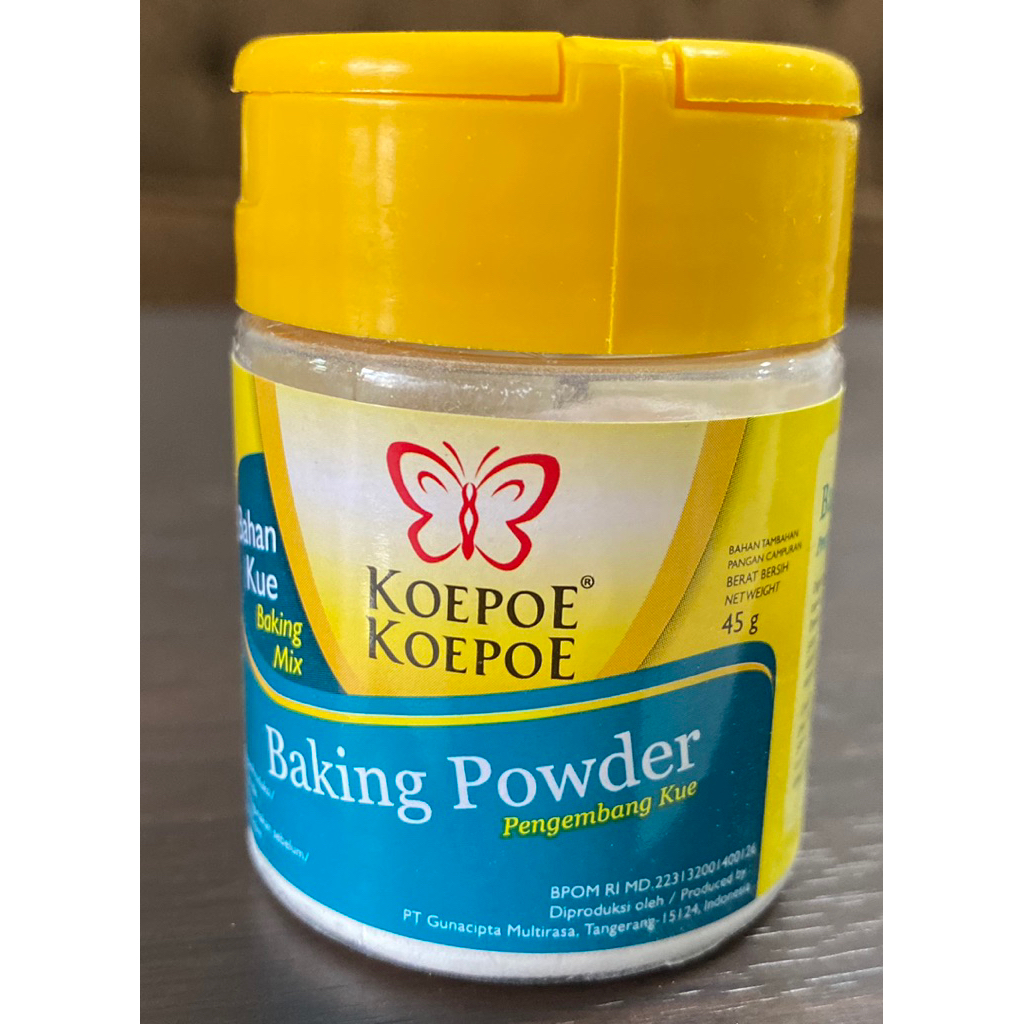 Baking Powder Koepoe Koepoe digunakan untuk mengembangkan berbagai macam adonan kue, bolu, roti dan biskuit. Dibuat dari bahan pilihan yang bermutu tinggi untuk kesempurnaan kue anda.