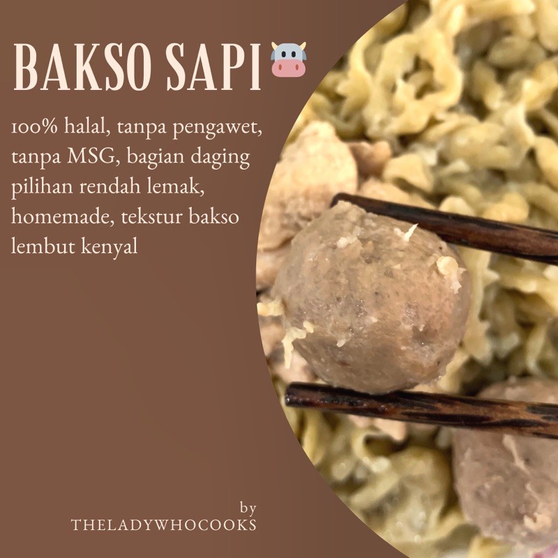 Bakso Sapi yang terbuat dari bagian daging sapi pilihan, rendah kadar lemak dan otot. Menghasilkan tekstur bakso yang lembut dan kenyal. Bisa disimpan maksimal di freezer (1minggu).