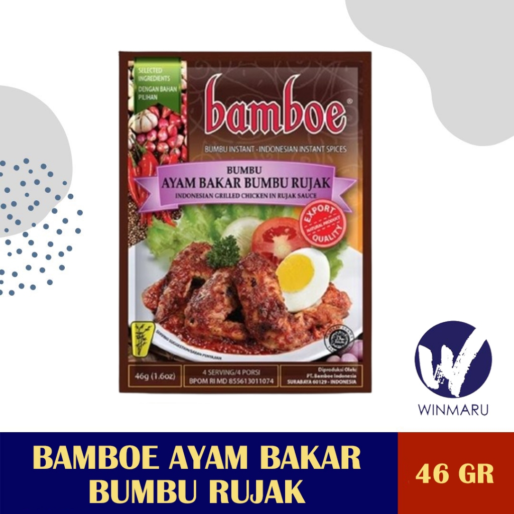 Bamboe Ayam Bakar Bumbu Rujak adalah Ayam yang dimasak perlahan dengan bumbu dan santan sebelum dipanggang, agar ayam menyerap bumbu. Sisa kuahnya bisa dijadikan olesan saat memanggang, atau sebagai kuah saat disantap bersama nasi.