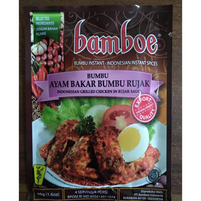 Bamboe Ayam Bakar Bumbu Rujak 46gr merupakan bumbu yang telah dikenal sejak tahun 1968. Bumbu Bamboe merupakan bumbu kemasan mempermudah dalam menyajikan hidangan special untuk keluarga.