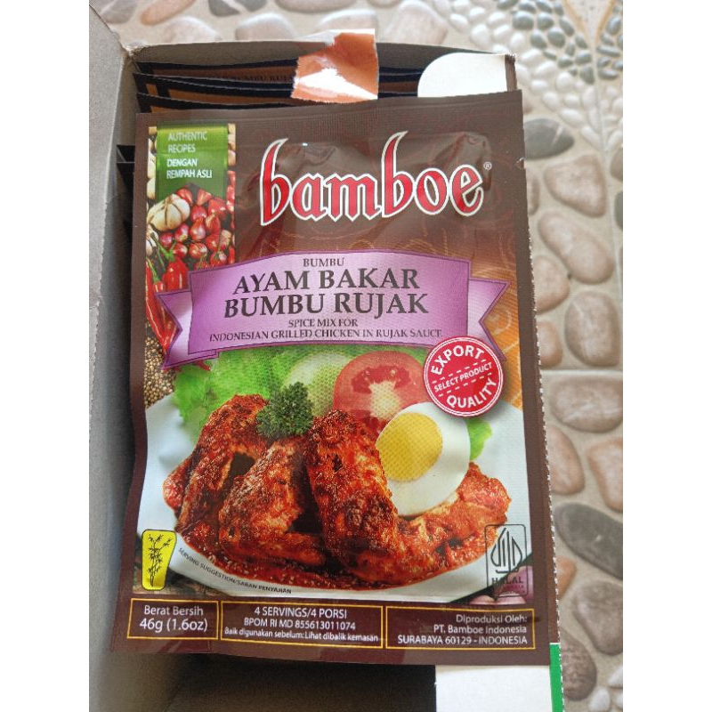 Deskripsi Produk. BAMBOE BARU AYAM BAKAR BUMBU RUJAK 49 GR. BAMBOE SPICE MIX adalah resep asli Indonesia siap masak pertama yang dibuat dari bahan ...