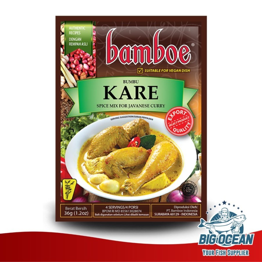 Bamboe Kare adalah bumbu instan yang praktis untuk membantu memasak Kare. Bumbu ini diolah menggunakan bahan-bahan pilihan yang berkualitas untuk menghasilkan hidangan Kare yang lezat. Cocok untuk membuat Kare dari berbagai bahan daging, seperti ayam ikan. 1 sachet bumbu instan ini memiliki berat 35 gram dan dapat digunakan untuk memasak 4 porsi makan.