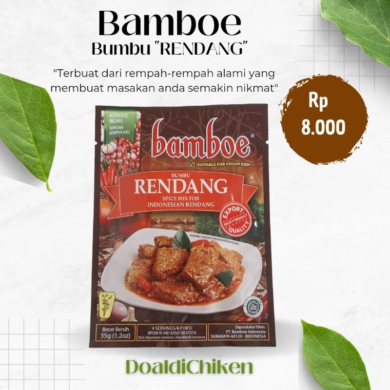 Bamboe Rendang adalah bumbu instan yang praktis untuk membantu memasak rendang. Bumbu ini diolah menggunakan bahan-bahan pilihan yang berkualitas untuk menghasilkan hidangan rendang yang lezat. Cocok untuk membuat rendang dari berbagai bahan daging, seperti sapi, kambing, bahkan ayam. 1 sachet bumbu instan ini memiliki berat 35 gram dan dapat digunakan untuk memasak 4 porsi makan.