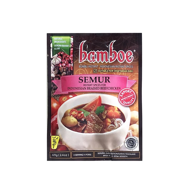Bamboe Bumbu Semur 69grmerupakan bumbu semur instan yang telah dikenal sejak tahun 1968. Diproduksi menggunakan pilihan bahan-bahan natural yang fresh dan berkualitas, tanpa tambahan extract, essence, maupun pewarna buatan. Kini hadir dalam kemasan yang praktis untuk mempermudah anda menyajikan hidangan spesial untuk keluarga. BPOM: MD 855613030074