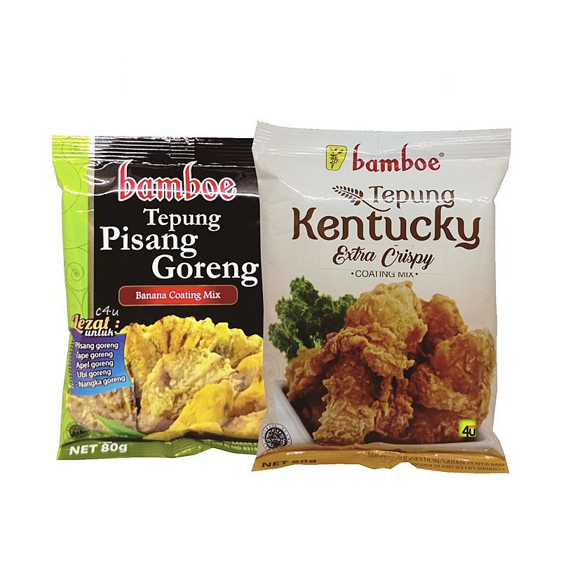 Bamboe yg terkenal dgn spesialisasi bumbu2 instan, juga mempunyai tepung bumbu untuk gorengan2 krispi anda. Terdiri dari 2 varian umum yaitu untuk gorengan krispi dan gorengan manis. Dikemas dalam sachet2 kecil dgn netto 80gr, beratribut lengkap BPOM RI dan Halal MUI. Petunjuk Penyajian tertera dikemasan.