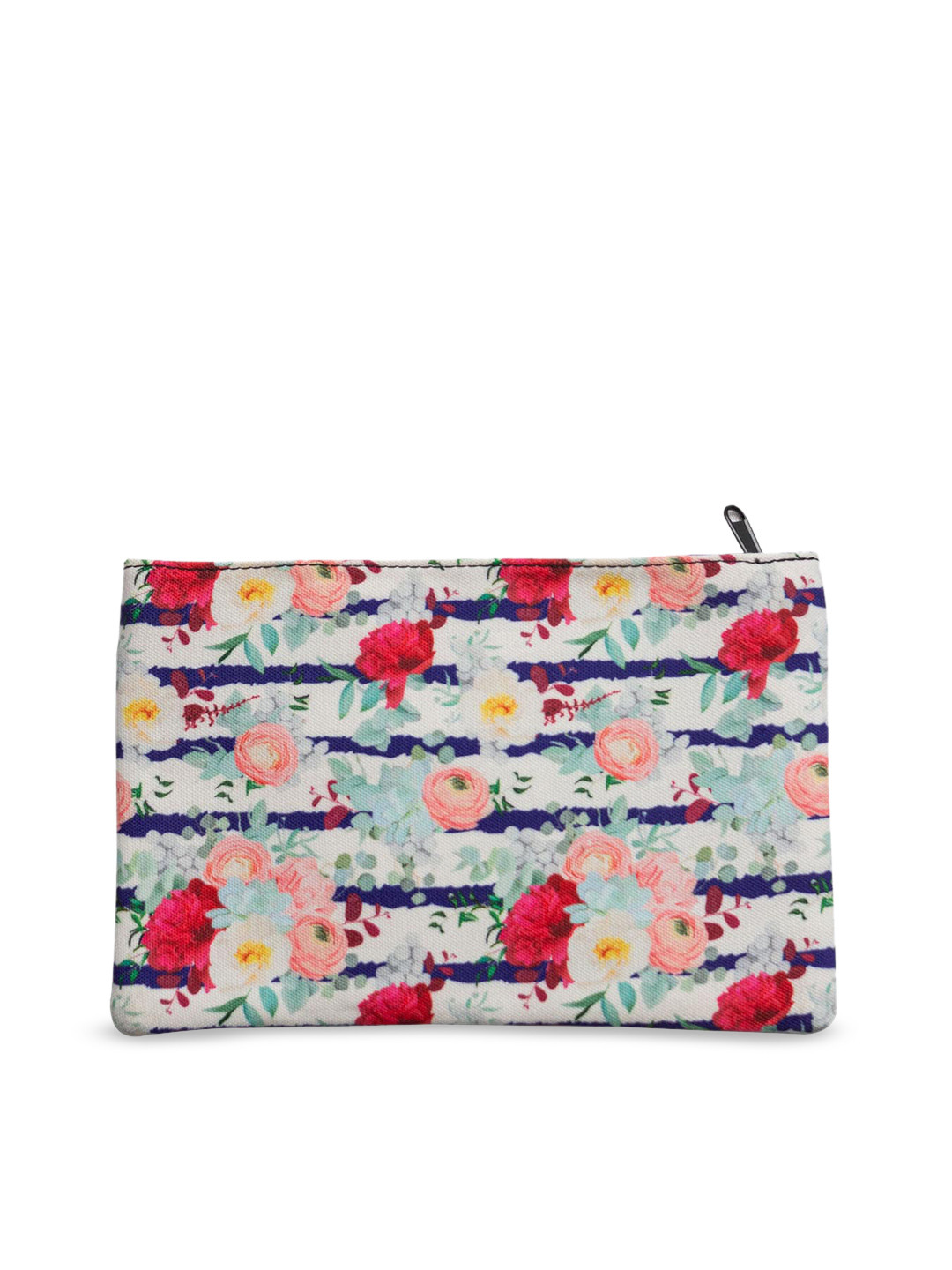 Off-white, red and blue floral printed striped pouch secured with a zip & 1 compartment