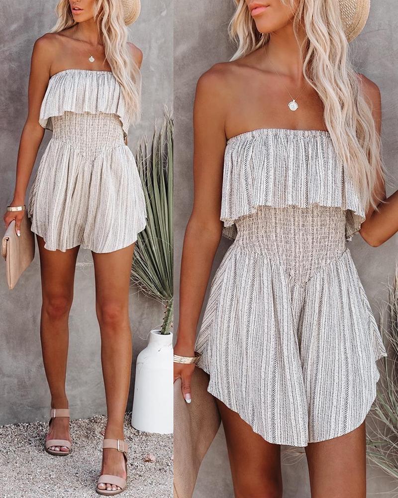 Bandeau Ruched All Over Print Shirred Romper, Beige