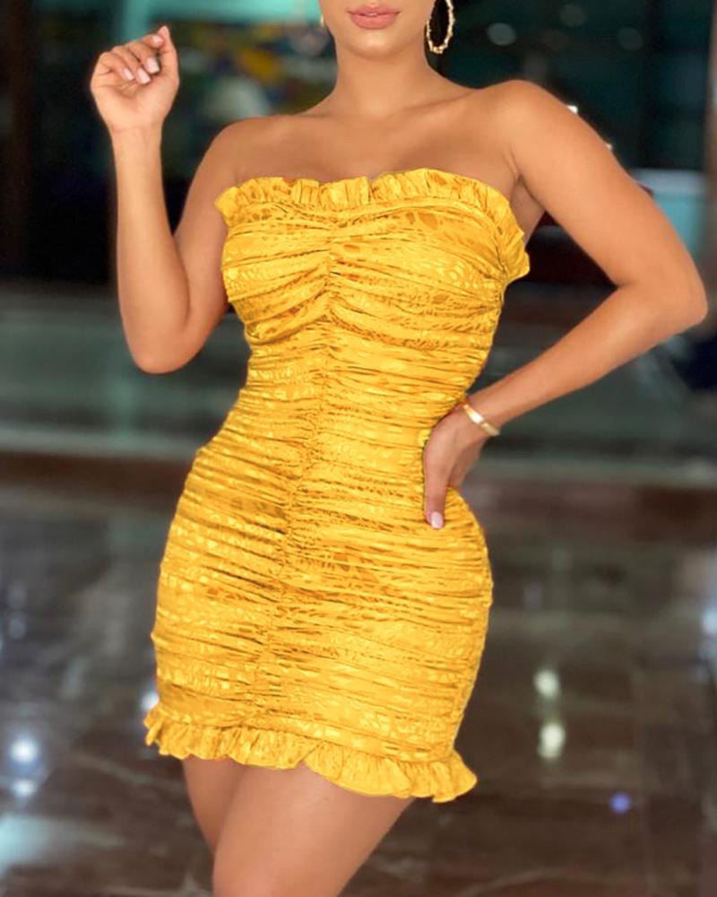 Bandeau Ruffles Hem Ruched Bodycon Dress, Yellow