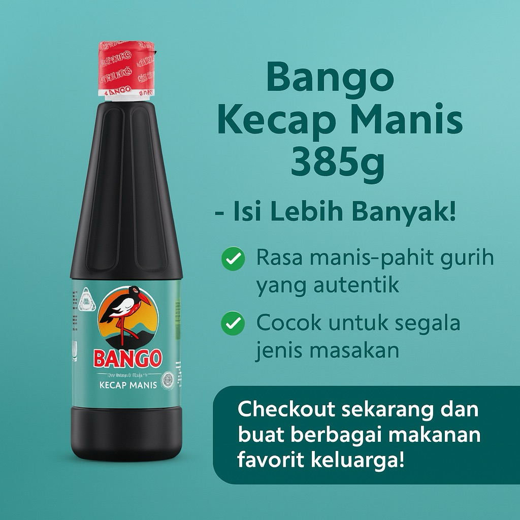 Nikmati kelezatan masakan rumahan dengan Bango Kecap Manis 385g! Hadir dengan rasa manis-pahit gurih yang otentik khas kedelai hitam berkualitas, kecap ini cocok untuk segala jenis masakan seperti tumisan, nasi goreng, semur, hingga sate.
