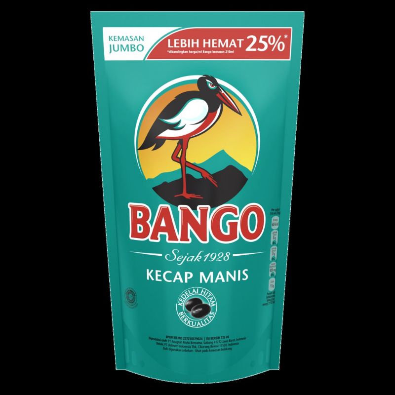 Bango Kecap Manis Pouch merupakan kecap manis yang terbuat dari bahan alami pilihan seperti kedelai hitam berkualitas, gula kelapa, garam, dan air. kedelai hitam pilihan difermentasi terlebih dulu beberapa bulan untuk kemudian melalui proses pengolahan khusus agar dapat berpadu sempurna dengan bahan-bahan lain untuk menghasilkan citarasa unik yang membuat Kecap Bango berbeda dari kecap-kecap lainnya. kecap ini hadir dalam kemasan pouch praktis yang memudahkana Anda untuk menyajikan hidangan istimewa dengan rasa yang nikmat.