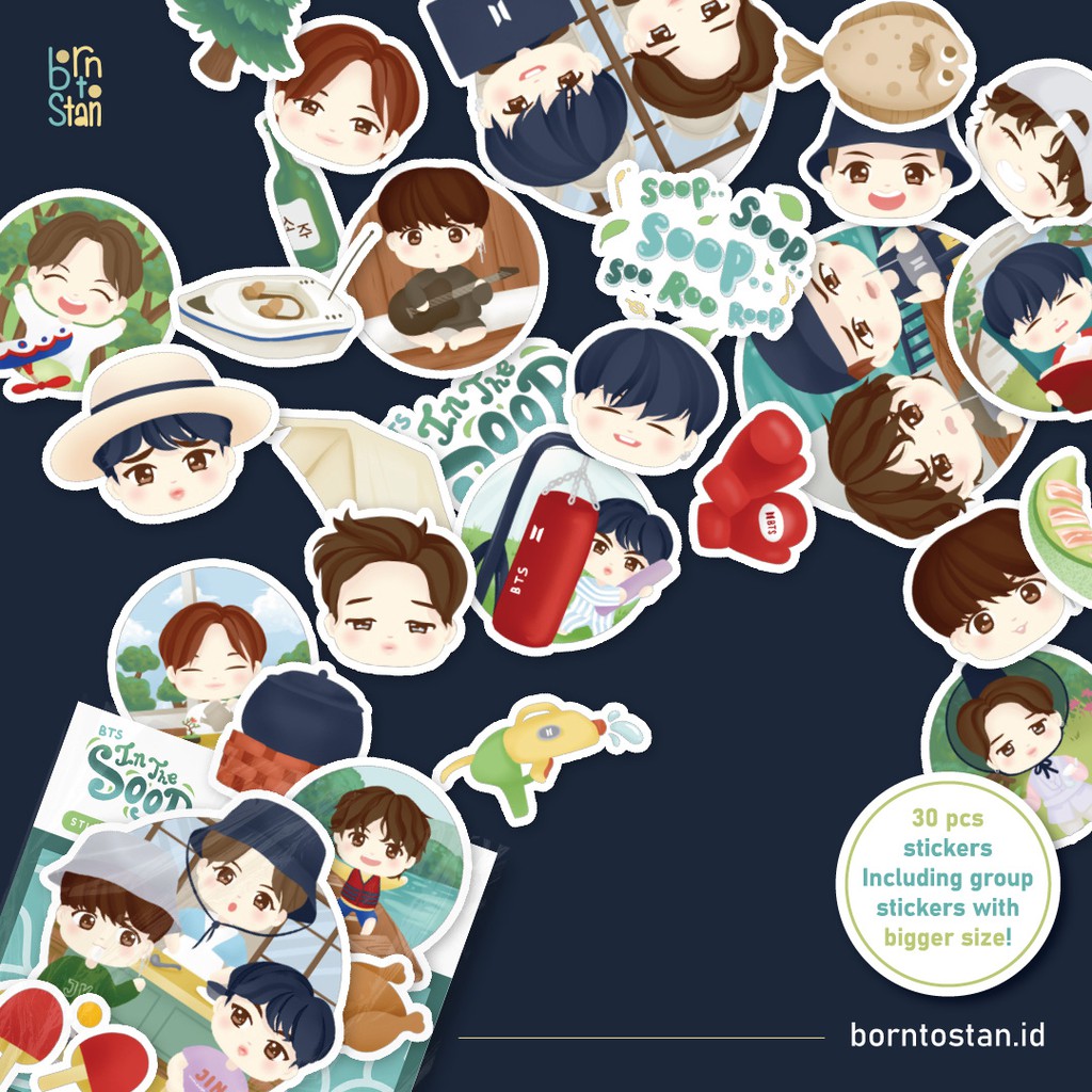 Sticker set Bangtan Sonyeondan In The Soop berisi 30 pcs per pack, termasuk seri baru group sticker dengan ukuran yang lebih besar.
