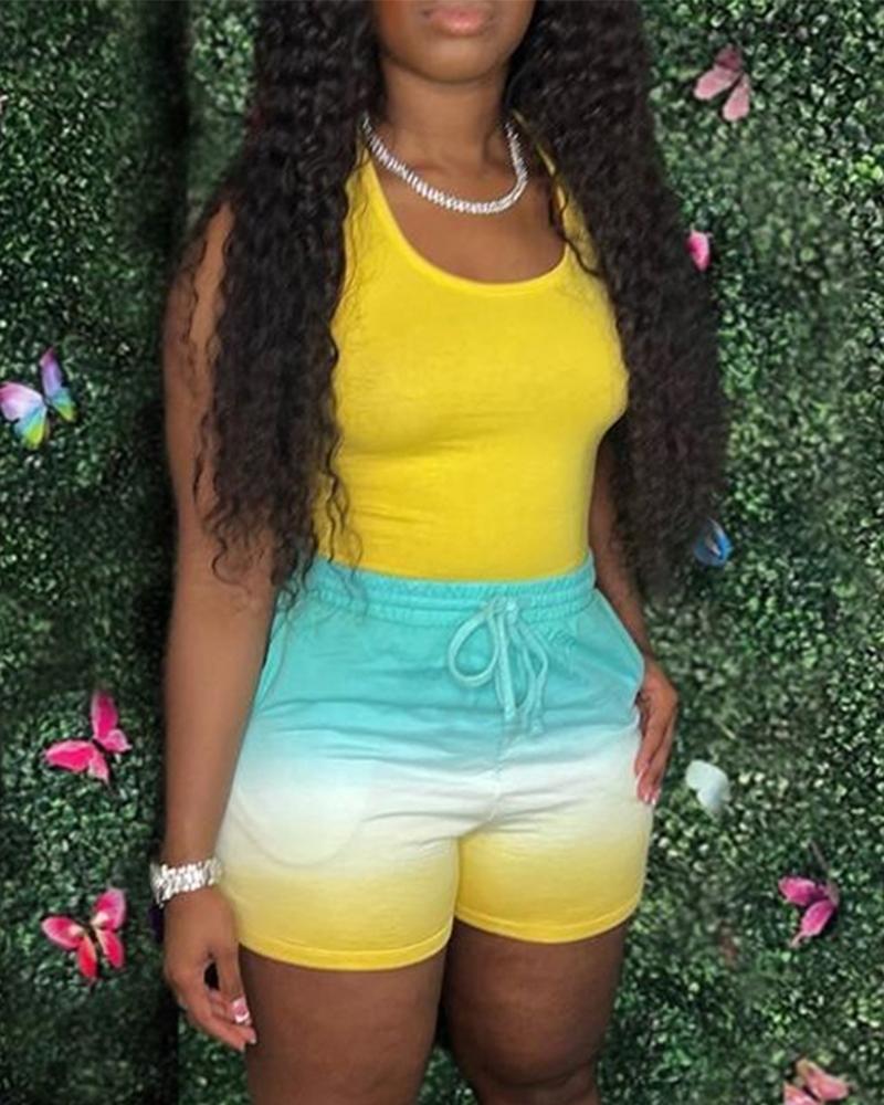 Basic Tank Top & Ombre Drawstring Shorts Set, Yellow