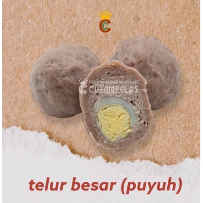Baso sapi Cihampelas varian isi telur besar adalah baso halus yg terdapat telur puyuh di dalamnya, dimana ukuranny lebih besar, terbuat dari daging sapi pilihan halal dan sehat.