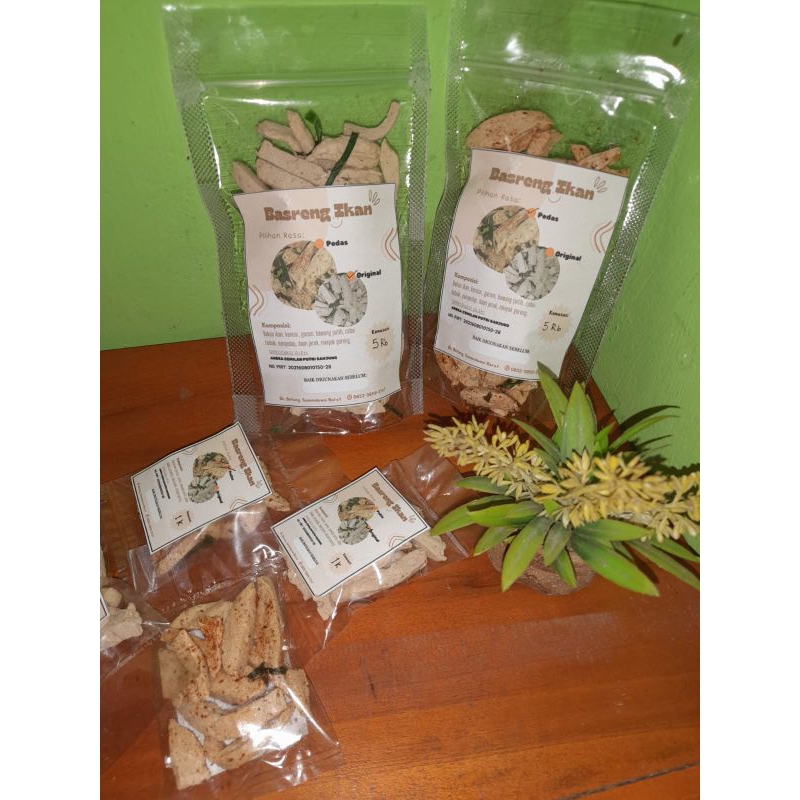 Basreng ikan kemasan 60 gr. Komposisi: Bakso ikan, kencur, garam, bawang putih, cabai bubuk, penyedap, daun jeruk, minyak goreng.