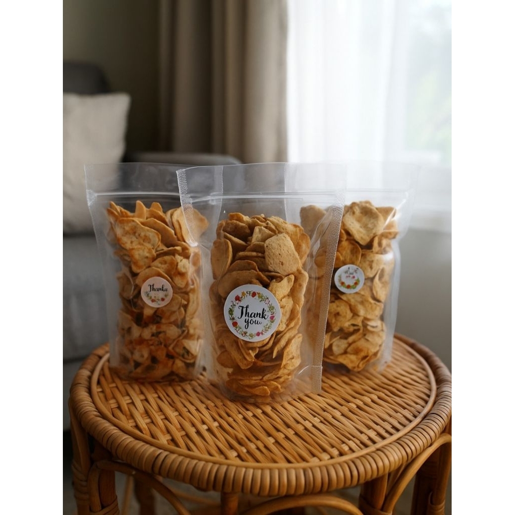 Basreng renyah dengan rasa gurih pedas yang di iris tipis dan digoreng hingga garing sempurna. dikemas dalam pouch standing transparan dengan segel rapat, menjaga kerenyahan dan cita rasa lebih lama.