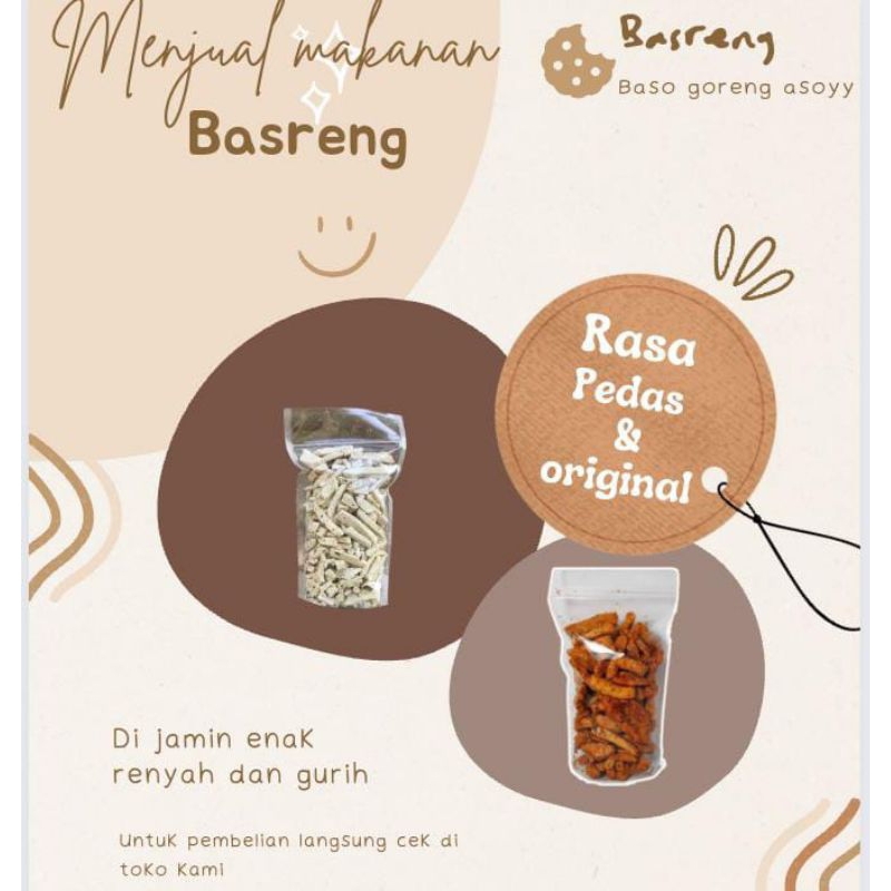 Basreng yang super renyah+ gurih dengan varian pedas daun jeruk & original, pas banget buat nemenin saat makan nasi anget, cocok untuk kamu yang hobi makan pedesss, bisa buat cemilan sambil ngerjain tugas, tv/film/derakor.