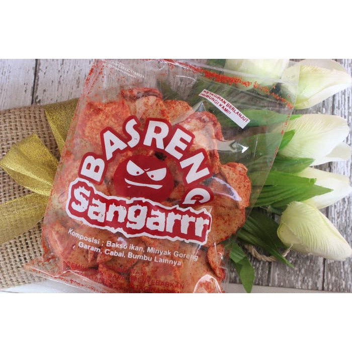 Basreng merupakan keripik Baso Ikan Goreng dengan rasa superrr pedas dan asin.