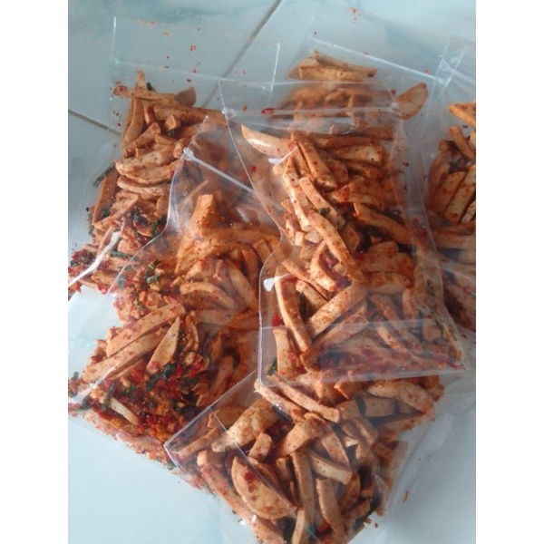Basreng Merupakan cemilan yang cocok banget buat nyantai bareng keluarga, rasanya renyah dan gurih ada dua varian rasa yaitu pedas dan original. kemasan mulai dari 50 gram sampe 1 Kg.