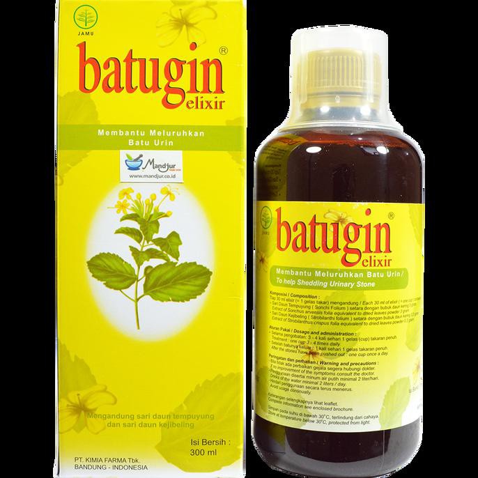 Batugin Elixir mengandung ekstrak Sonchus arvensis folia dan ekstrak Strobilanthus crispus folia sebagai tanaman berkhasiat dalam larutan spesifik yang optimal. Obat ini memiliki khasiat yang efektif dalam membantu meluruhkan batu urin di ginjal maupun di saluran kemih, selain itu juga dapat membantu melancarkan buang kecil.
