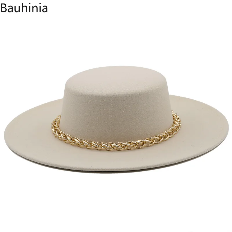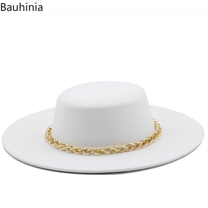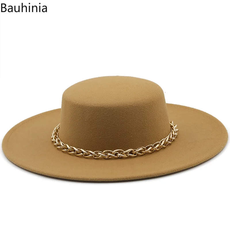 Bauhinia винтажная черная шерстяная искусственная Роскошная золотая цепочка с ремешком Зима 10 см поля Дерби плоская шляпа джаз платье Кепка