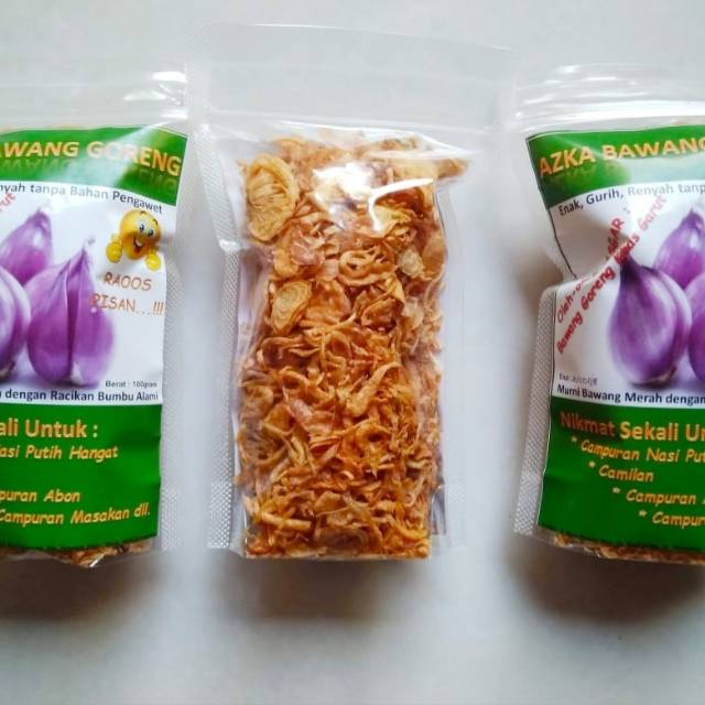Terbuat dari bawang merah murni pilihan tanpa bahan pengawet, renyah, dengan bumbu pilihan membuat rasa lebih gurih, enak dan nikmat dengan rasa original dan pedas. Bisa dibuat sebagai cemilan, penambah rasa masakan atau ditambahkan untuk nasi hangat.
