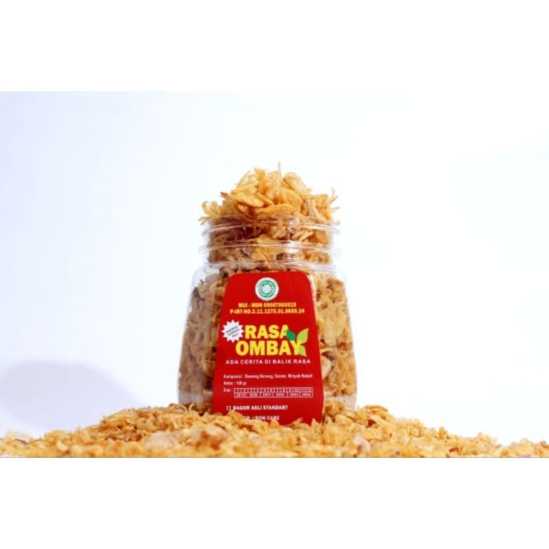 Bawang goreng rasa ombay yang terbuat dari bawang merah khusus untuk bawang goreng. Menggunakan bahan2 pilihan seperti minyak kemasan bermerek. Alat yang menunjang hasil bawang gorrng yang kering dan tidak berminyak, sehingga bawang tudak mudah berbau dan lebih awet, meskipun tanpa bahan pengawet.
