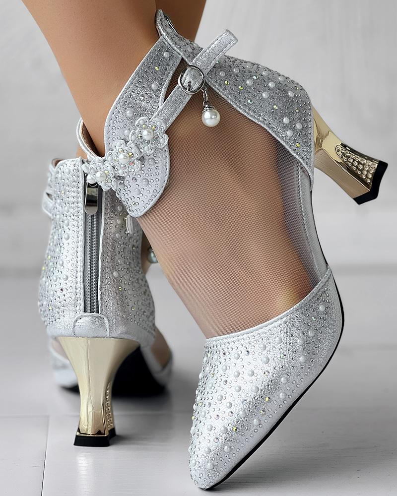 Beaded Rhinestone Mesh Patchwork Pyramid Heel Ankle Boots, Silver
