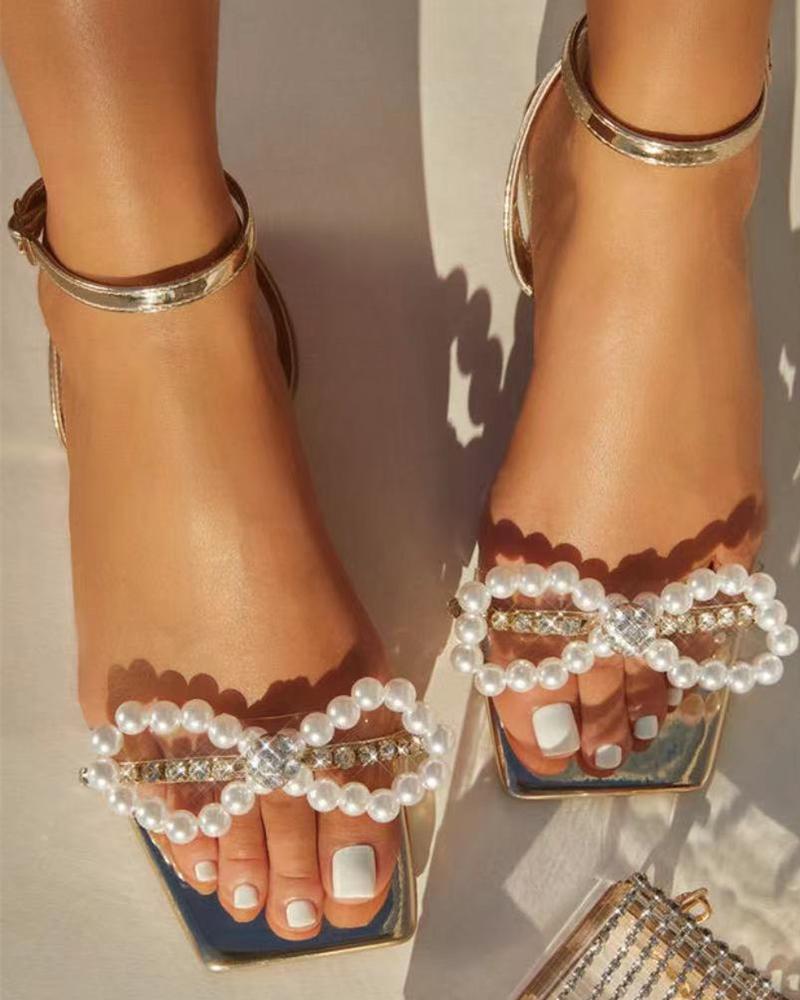 Beaded Square Toe Rhinestone Ankle Strap Sandals, Gold