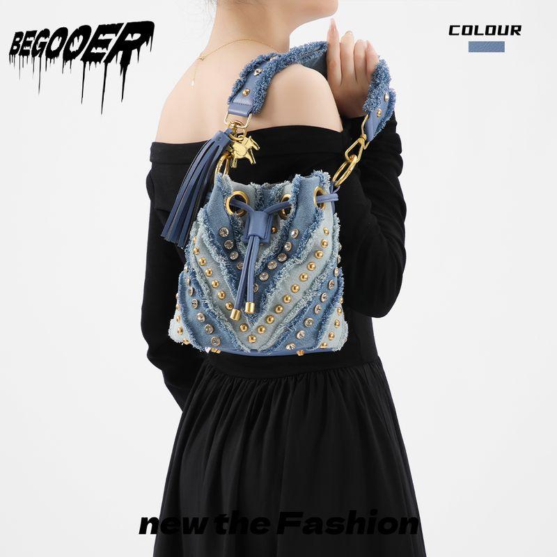 Begooer Нишевый стиль Доступная роскошь Мода Сумка-ведро с бриллиантами Необычная джинсовая сумка с заклепками Ручная/На плечо/Мессенджер Cowboy Blue