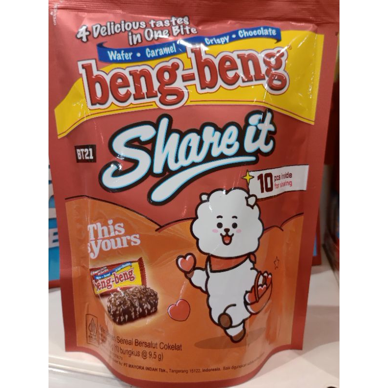 BENG-BENG Share It Special Edition BT21 merupakan wafer cokelat dengan rice crispy yang berbalut cokelat susu yang nikmat. Lapisan cream yang lezat dan lembut, cemilan ini tidak bisa ditolak oleh segala usia. Sangat cocok untuk cemilan dikala senggang, dimana saja dan kapan saja atau ideal juga dijadikan cemilan sehat saat santai Anda bersama keluarga.