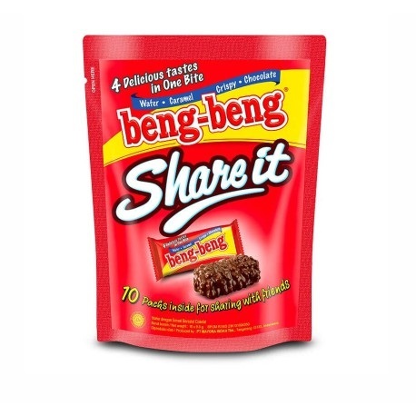 BENG-BENG Share It merupakan wafer cokelat dengan rice crispy yang berbalut cokelat susu yang nikmat. Lapisan cream yang lezat dan lembut, cemilan ini tidak bisa ditolak oleh segala usia. Sangat cocok untuk cemilan dikala senggang, dimana saja dan kapan sajaa atau ideal juga dijadikan cemilan sehat saat santai Anda bersama keluarga.