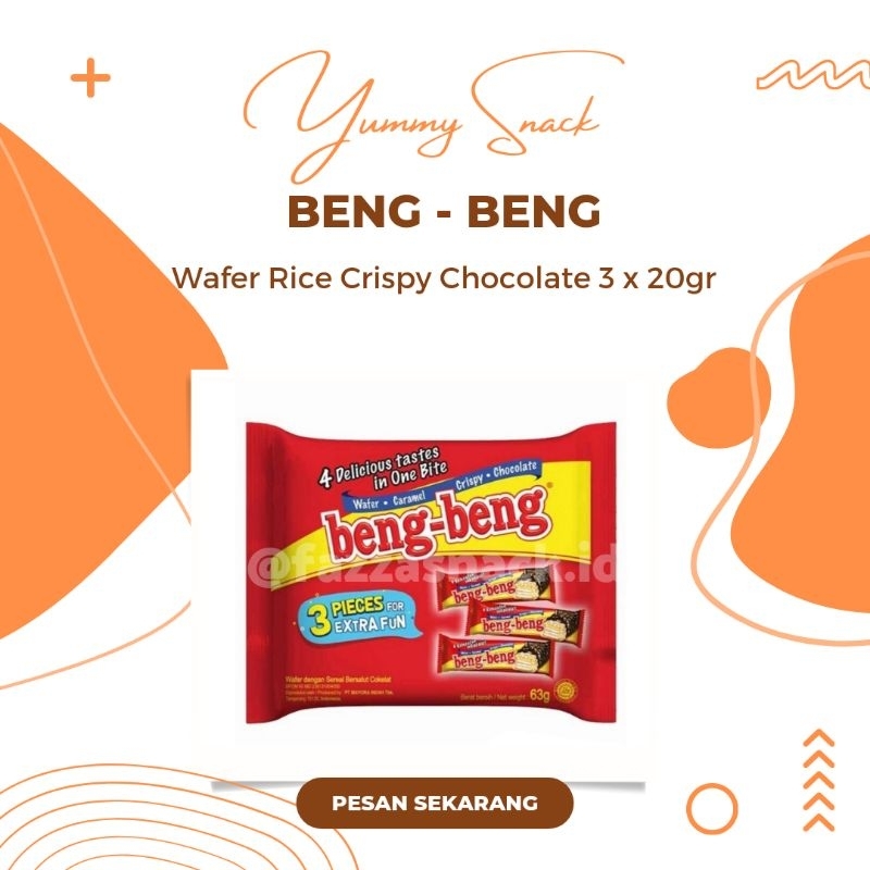 Beng - Beng Wafer Rice Crispy Chocolate 3 x 20 gr adalah makanan ringan berbentuk snack bar. Dibuat dengan menggunakan bahan bahan berkualitas yang diolah secara higienis dan menggunakan teknologi berstandar tinggi. Snack dibuat dengan beberapa lapisan, wafer vanilla yang dibalur oleh saus karamel yang manis dan nikmat, dan diberikan taburan rice crispies di atasnya untuk memberikan sensasi rasa renyah saat digigit. Dibalur kembali dengan cokelat nikmat sebagai lapisan terkakhir. Dalam sekali gigitan, berbagai lapisan rasa yang dikombinasikan bercampur menjadi satu secara nikmat. Cocok disajikan dalam kondisi dingin atau disantap secara langsung. Dikemas menggunakan kemasan khusus yang terdapat tiga kemasan individual di dalamnya.