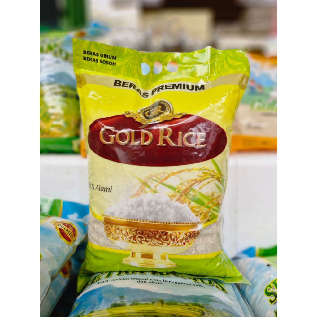 Beras Gold Rice! Merek beras yang berkualitas! Gold Rice mungkin menandakan bahwa beras ini memiliki kualitas premium dan rasa yang lezat.
