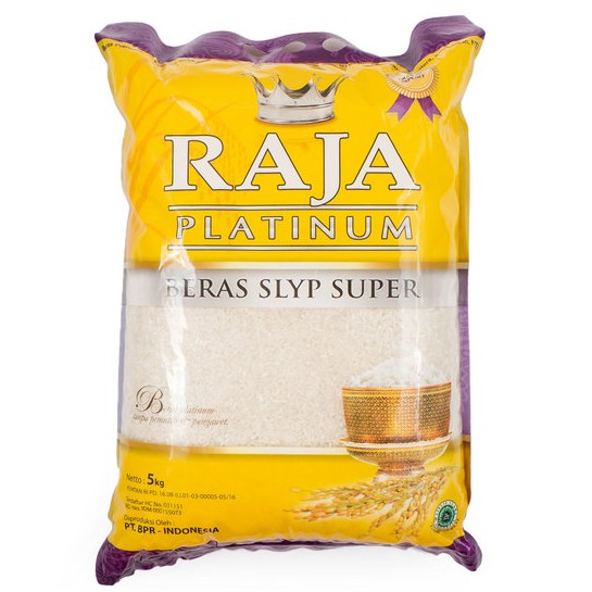 Beras Platinum tanpa pemutih dan pengawet ukuran 5 kg brand lokal Raja Platinum.