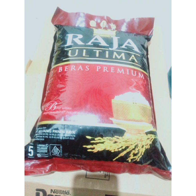 Beras Raja diproses dari varietas padi murni menggunakan mesin-mesin berteknologi tinggi hingga menghasilkan beras berkualitas. Beras ini higienis karena dibuat tanpa pemutih, pengawet dan pewangi. Beras Raja Ultima ini memiliki jenis beras pulen dengan kualitas premium. Beras 5 kilogram.