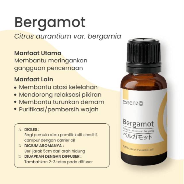 Bergamot Essential Oil dari Essenzo ini sangat berkhasiat untuk mengatasi Masalah Pencernaan & Menenangkan Pikiran, karena Bergamot Essential Oil dari Essenzo terbuat dari 100% konsentrasi liquid Bergamot Alami tanpa ada bahan campuran apapun.