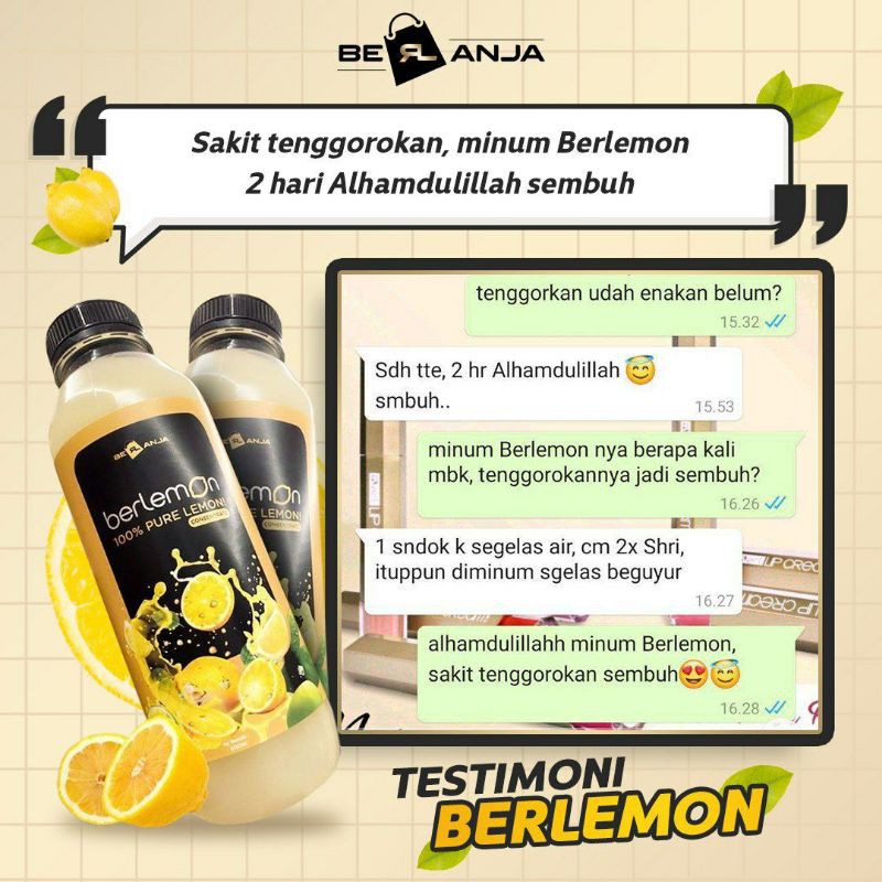 Berlemon merupakan minuman kesehatan yang diambil dari 100% ekstra sari lemon murni tanpa tambahan air atau bahan lainnya. Buah Lemon adalah kerabat dari jenis sitrus yang berkulit kuning cerah serta terbukti secara ilmiah punya banyak manfaat untuk kecantikan dan kesehatan.