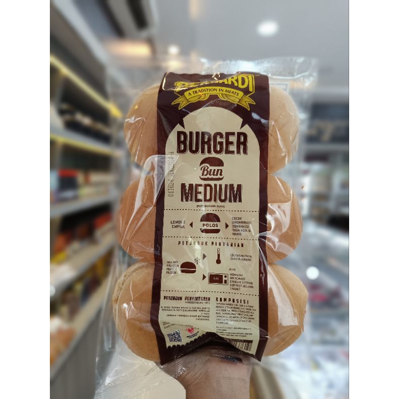 Roti burger bun Medium isi 6 biji , dengan tekstur lembut, empuk dan sedikit manis. Biasa nya di isi dengan daging burger slice atau telur dadar kemudian di tambah dengan sayur slada dan di beri topping saos dan mayonaise. Bisa juga dikombinasikan dengan isian rasa manis seperti selai, susu atau meises.