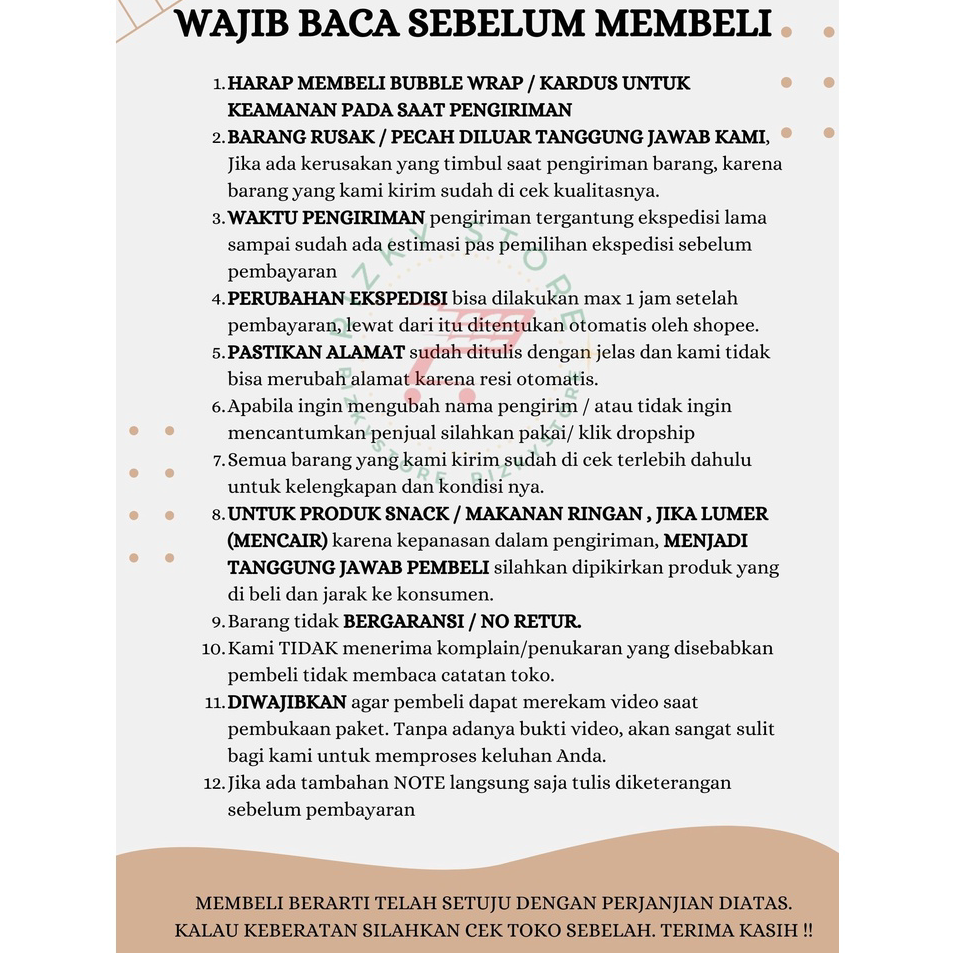Best Product Marie Regal 120gr/230gr/Renceng SH-31-10-23 Tersedia 3 varian: 1. 120gr exp 09/24 2. 230gr exp 10/24 3. Renceng 10 @ 12 gram exp 07/24 Produk ini beresiko hancur selama dalam ekspedisi WAJIB BACA SEBELUM MEMBELI : * HARAP MEMBELI BUBBLE WRAP / KARDUS UNTUK KEAMANAN PADA SAAT PENGIRIMAN * BARANG RUSAK / PECAH DILUAR TANGGUNG JAWAB KAMI BILA TIDAK MEMBELI BUBBLE WRAP * WAKTU PENGIRIMAN pengiriman tergantung ekspedisi lama sampai sudah ada estimasi pas pemilihan ekspedisi sebelum pembayaran * PERUBAHAN EKSPEDISI bisa dilakukan max 1 jam setelah pembayaran, lewat dari itu ditentukan otomatis oleh shopee. * PASTIKAN ALAMAT sudah ditulis dengan jelas dan kami tidak bisa merubah alamat karena resi otomatis. * Apabila ingin mengubah nama pengirim / atau tidak ingin mencantumkan penjual silahkan pakai/ klik dropship , ini juga bisa di pakai reseller * Semua barang yang kami kirim sudah di cek terlebih dahulu untuk kelengkapan dan kondisi nya. * Jika ada kerusakan yang timbul saat pengiriman barang maka hal tersebut di luar tanggung jawab kami, karena barang yang kami kirim sudah di cek kualitasnya. * UNTUK PRODUK SNACK / MAKANAN RINGAN , JIKA LUMER (MENCAIR) karena kepanasan dalam pengiriman, MENJADI TANGGUNG JAWAB PEMBELI silahkan dipikirkan produk yang di beli dan jarak ke konsumen. * Jika stock kosong, segera kami infokan via chat. * Kami tidak akan mengirimkan barang yang pecah, rusak & bekas. * Barang tidak BERGARANSI / NO RETUR. * Kami TIDAK menerima komplain/penukaran yang disebabkan pembeli tidak membaca catatan toko. * DIWAJIBKAN agar pembeli dapat merekam video saat pembukaan paket. Tanpa adanya bukti video, akan sangat sulit bagi kami untuk memproses keluhan Anda. * Jika ada tambahan NOTE langsung saja tulis diketerangan sebelum pembayaran MEMBELI BERARTI TELAH SETUJU DENGAN PERJANJIAN DIATAS. KALAU KEBERATAN SILAHKAN CEK TOKO SEBELAH. TERIMA KASIH !! NOTE kami tidak menjamin cokelat tidak meleleh Happy shopping - Fast respon jam kerja Senin - Sabtu pukul 8.00 - 16.00, Minggu atau hari libur Off - Mohon mencantumkan warna/gambar/varian pilihan dan cadangannya (jika ada) di kolom pemesanan ya. Jika tidak mencantumkan pilihan, maka akan kami kirimkan sesuai stok yang ready!!! - Pengiriman pada Hari yang sama (malamnya). - Jika barang yang di pesan kosong dan tidak ada respon selama 1x24 jam maka akan di kirim secara random. - Periksa kembali NOMOR HP (TELP) & ALAMAT LENGKAP. Guna mempercepat dan memperlancar pengiriman. - BARANG YANG SUDAH DI BELI TIDAK BISA DI KEMBALIKAN. - Gudang kita ada di Beberapa Alamat Jabodetabek... Jadi pengiriman tidak selalu sesuai alamat toko ini yaaa.. >>>> MEMBELI = SETUJU