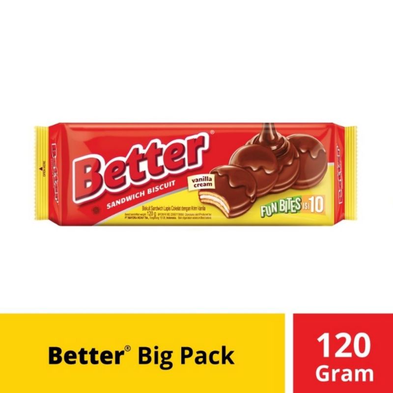 Better Fun Bites Big Pack 120gr merupakan biskuit dengan vanila krim. Sandwich biskuit dengan krim vanilla lembut yang dilapisi dengan cokelat tebal yang lezat. Memberi Anda rasa yang sempurna untuk setiap momen. #better #snack