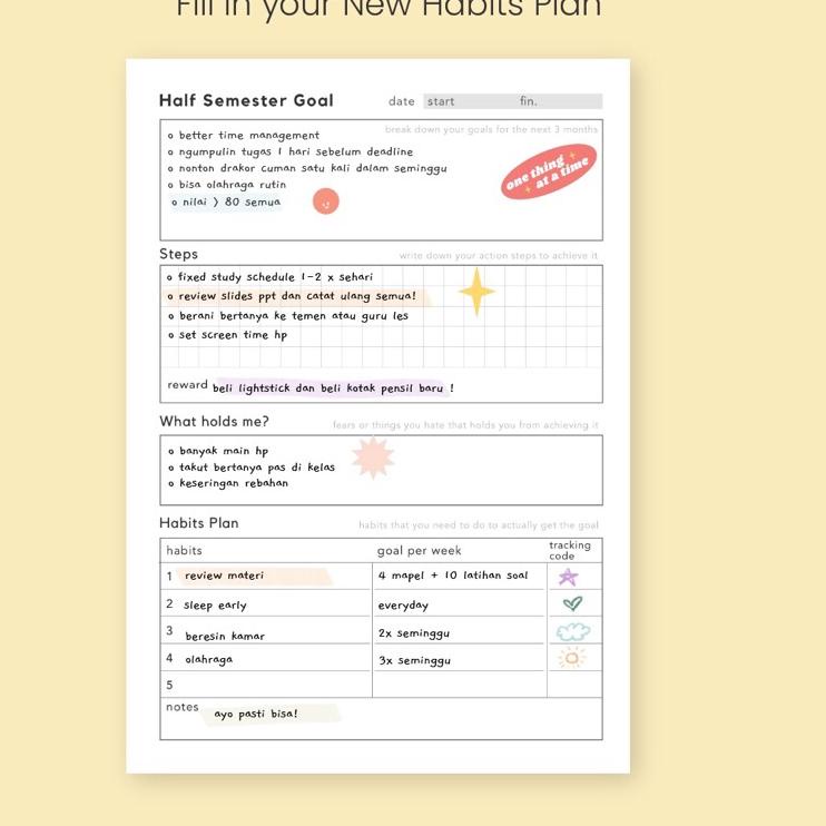 BUDAYAKAN MEMBACA SEBELUM MELAKUKAN PEMBELIAN Winyo Study Planner - 1 Semester/6 Months (+ Free Sticker) Undated Study Planner untuk 1 semester/6 bulan. Planner dengan layout clean dan simple, didesain oleh Winyo.co khusus untuk kamu agar bisa lebih produktif dan ga skip tugas lagi :) P.s Free sticker sheet inside! Details: Doff soft cover A5. 114 pages bookpaper. Ringan untuk dibawa kemana-mana! Available in color: Sage green, Lilac, Gradient, and Checkered blue. Planner Feature: - Personal Data - Semester Overview (6 months plan) - Schedule & Routine Plan - Semester Resolution - Semester Goal & Habits Plan - Study Reflection - Grade Tracker - Monthly Plan - Weekly Plan with daily habit tracker - Semester & End of Semester Review - Blank Pages for brain dump Free Sticker Choice: Sun, Cat, Cherry, and Daisy by Winyo Studio - Fast respon jam kerja Senin - Jumat pukul 9.00 - 17.00, Sabtu pukul 9.00 - 14.00, Minggu atau hari libur Off - Mohon mencantumkan warna/gambar/varian pilihan dan cadangannya (jika ada) di kolom pemesanan ya. Jika tidak mencantumkan pilihan, maka akan kami kirimkan sesuai stok yang ready!!! - Pengiriman pada H+1 (malamnya). - Jika barang yang di pesan kosong dan tidak ada respon selama 1x24 jam maka akan di kirim secara random. - Periksa kembali NOMOR HP (TELP) & ALAMAT LENGKAP. Guna mempercepat dan memperlancar pengiriman. - BARANG YANG SUDAH DI BELI TIDAK BISA DI KEMBALIKAN. - Gudang kita ada di DKI Jakarta, Jawa Timur, Jawa Tengah, Jawa Barat dan lainnya. Jadi pengiriman tidak selalu sesuai alamat toko ini yaaa.. >>>> MEMBELI = SETUJU