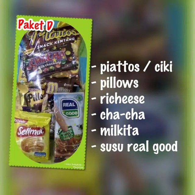 Isi Bingkisan piattos, pillows, richeese, cha-cha, milkita, susu real good
