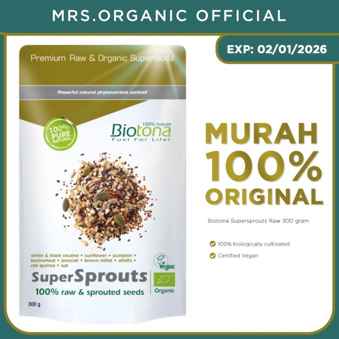 Biotona bio SuperSprouts Raw adalah campuran unggul dari benih organik kecambah soba, brokoli, millet coklat, oat, alfalfa, labu, bunga matahari; quinoa merah, wijen putih dan hitam. Setelah dicuci bersih, benih dibiarkan berkecambah di piring selama 1 hingga 2 hari dalam kondisi yang diawasi. Perkecambahan melepaskan kekuatan hidup yang tersembunyi di dalam benih dan menanamkan banyak karakteristik positif kepada mereka. Selain itu, biji yang bertunas lebih mudah dicerna. Setelah berkecambah dikeringkan selama 24 jam pada suhu maksimal 42C. Pemrosesan benih Biotona menjamin kualitas tertinggi, sekaligus mempertahankan semua nutrisi dan vitamin terpenting. Teknik pemrosesan ini tidak boleh dibandingkan dengan pemrosesan benih dan sereal komersial standar, yang sering menggunakan suhu hingga 100C. Budidaya organik dan teknik pengolahan yang sangat spesifik menjadikan Biotona SuperSprouts lezat dan renyah.