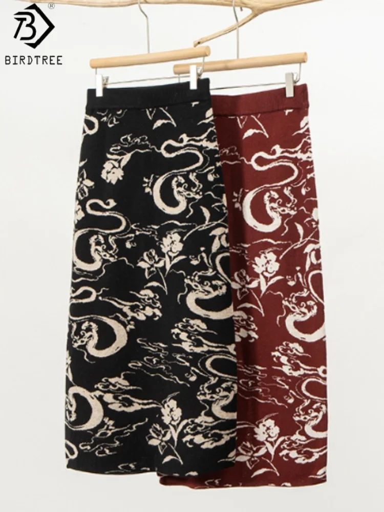 Birdtree 32,4% овечья шерсть 30,1% акриловая юбка с принтом, женские жаккардовые эластичные талии, осенние прямые платья в стиле поездок на работу D58528JF