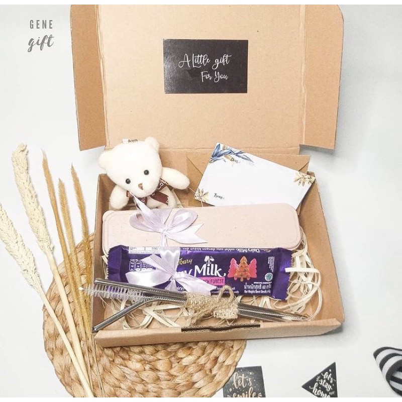 Gift Box yang simple ini cocok banget loh buat hadiah untuk orang yang spesialmu. Mini teddy yang lucu dengan cokelat favorit kita semua, dan lebih higienis menggunakan set alat makan sendiri