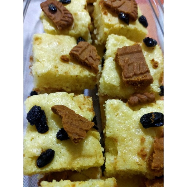 Blondies coklat putih yang kaya rasa dengan toping biscoff dan kismis