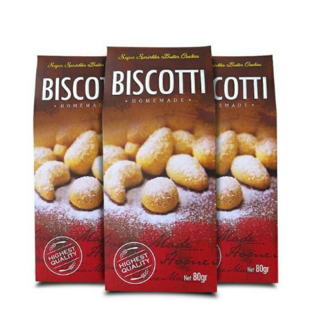 Biscotti merupakan cookies yang diadaptasi dari Italy, tapi kalau yang ini diracik dan asli buatan Bandung. Cookies ini terbuat dari perpaduan Dutch Butter, Susu, Tepung Terigu, dan di dalamnya ada kacang mede dengan taburan sprinkle sugar. Mirip kue putri salju dengan rasa yang sedikit berbeda
